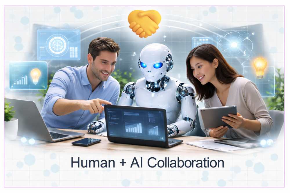 Humans provide strategic oversight, creativity, and governance. AI handles repetitive, data-heavy tasks. Together, they unlock innovation and growth.